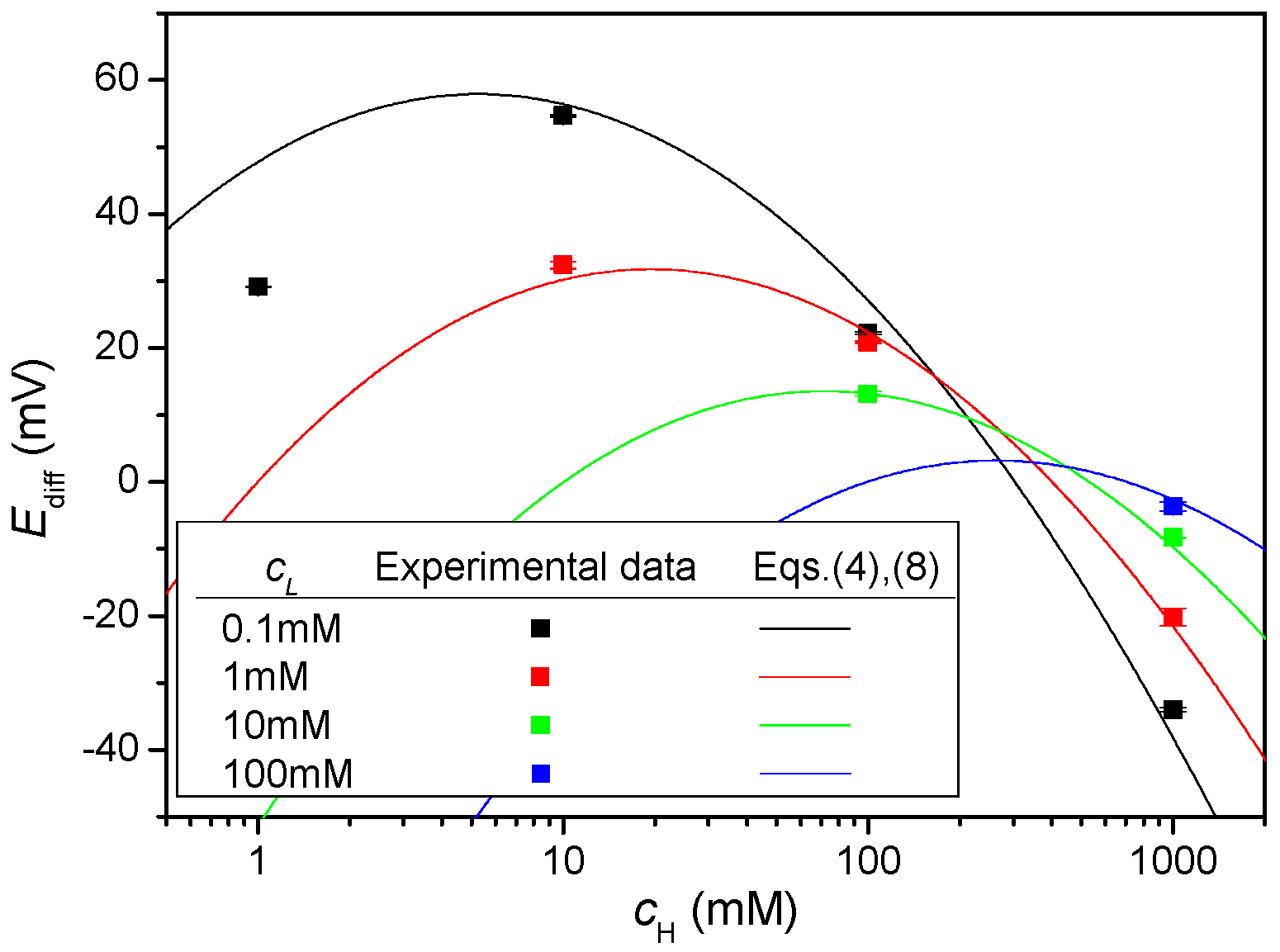 | cL (M) | cH (M) | t+ | Ediff (mV) | RA (Ω·cm2) | Pmax/A (mW/m2) |