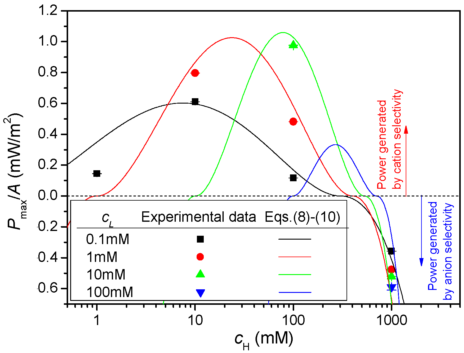 A calculated using Equations (8)–(10) and that the values agree well with the experimental data. Power is generated at low concentrations because of the cation selectivity of the silica membrane. At high concentrations (
