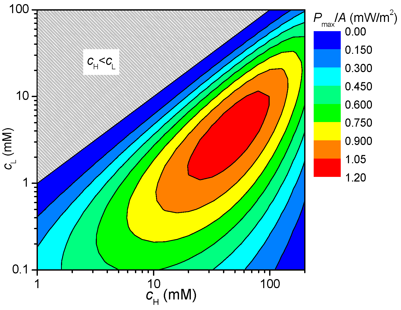 Contour map of maximum power generation density as a function of cL and cH.
