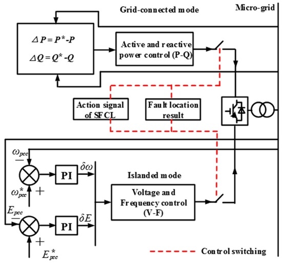 Note that the DG1 and DG2 will always adopt the P-Q control, and the DG3 will switch to the V-F control from the original P-Q control when the micro-grid should be separated from the main network. Figure 6 shows the schematic diagram of the control mode switching of the DG3. From the figure, the control switching should consider the SFCL’s action signal and the fault location result, which will be sent to the control system of DG3 for operating the two logical switches.