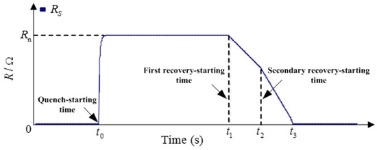 During the simulation, the SFCL’s controlled switch is simulated by an anti-parallel IGBT pairs, and the coupling transformer is based on a standard transformer model from the MATLAB model library. The quench/recovery model of the superconducting coil is according to Figure 7 [47], and the SC’s operating characteristic can be expressed as: