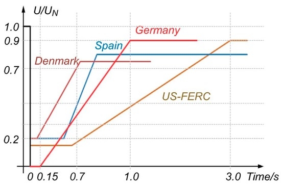 As shown in Figure 8, different FRT curves of a defined stay-connected time for IIDG are indicated [48,49]. From this figure, the FRT requirement differs from one standard to the other based on the countries’ grid code. During the simulations, the Denmark code is selectively used, and in the case that the grid voltage drops to 20% of the nominal level, the IIDG should remain in the grid-connected state for a duration of 150 ms.