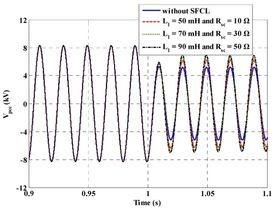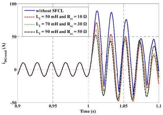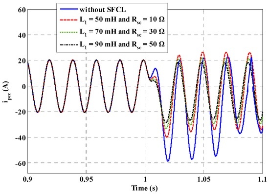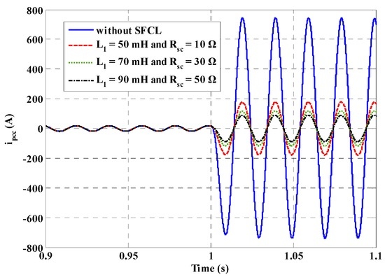 Different SFCL parameters are also considered, and Figure 9 shows the fault current flowing from the micro-grid side to the PCC (taking the A-phase as an example). The SFCL’s current-limiting effects will become more obvious along with the increase of the SFCL parameters, but since the fault current is mainly contributed by the DG units, the maximum amplitude of the fault current will generally not reach a very high level. From this perspective, it may not be necessary to excessively increase the SFCL parameters.