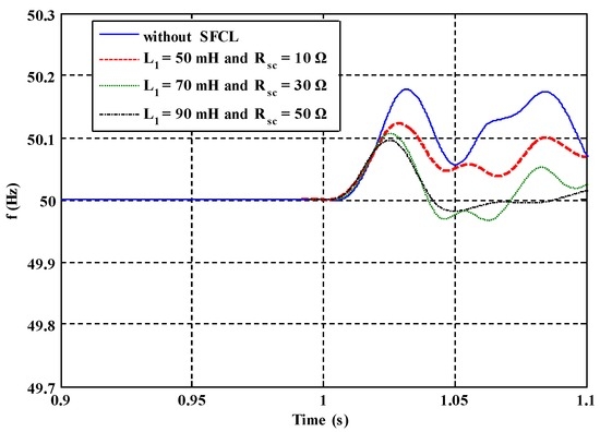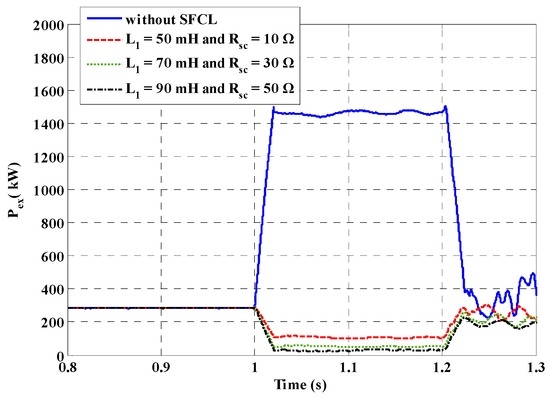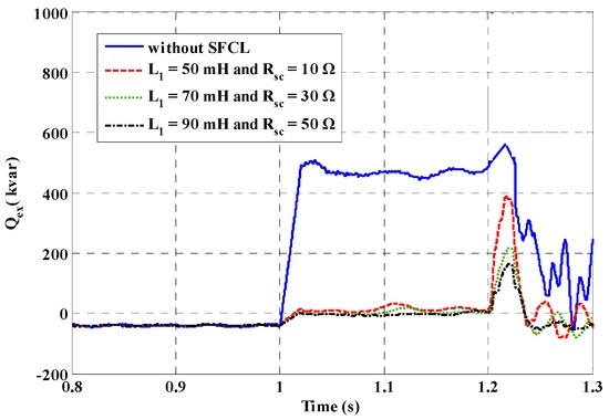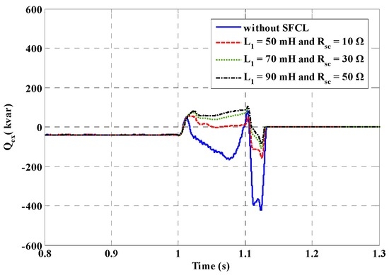 Figure 16, Figure 17, Figure 18 and Figure 19 show the DG voltage, exchange power and frequency fluctuations of the micro-grid system under the internal fault. From these figures, the positive effects of the two SFCLs can be observed. In the case of without the SFCL, the main network will sell an amount of active power and reactive power to the main network under the fault, and the power fluctuations will be very obvious. Along with the increase of the SFCLs’ current-limiting parameters, the exchange power will be reduced to be lower than the normal level. Since the power Load 1 is shorted, the decrease of the exchange power and the full utilization of the local DG units can help to achieve the power balance. In addition, taking the enhancement of the micro-grid’s frequency stability as an example, employing the SFCLs can make the fluctuating margin of the micro-grid frequency limited within 0.11 Hz, compared to it rising to 0.62 Hz under the condition without the SFCL.