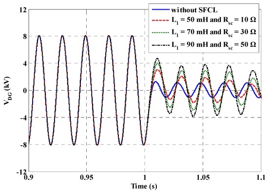 Owing to the introduction of the flux-coupling-type SFCL, it has a natural function of limiting the fault current, and during the process of current limitation, its impedance is actually connected in series with the main circuit. Considering that the SFCL is installed near the set-up transformer with the energy storage unit, it can be obtained that introducing the current-limiting impedance causes the energy storage unit to be far away from the fault location. Thus, although the voltage sag at the fault location cannot be avoided, the energy storage unit’s output voltage can be improved as compared with the case without the SFCL.