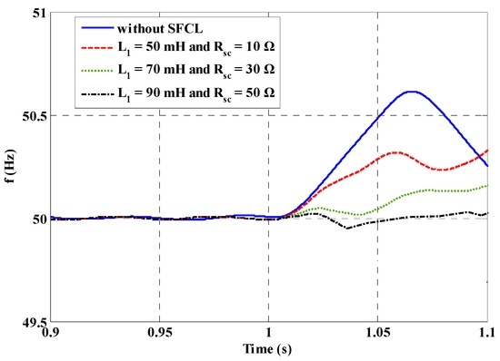 Compared to the original flux-coupling-type SFCL, which is purely inductive [34,35,36], the suggested SFCL is a resistive-inductive-type (hybrid type) SFCL, which can potentially bring more positive contributions, such as inhibiting power fluctuations, restraining electromagnetic oscillations, as well as providing critical assistance to the reliabilities and securities of power systems more effectively [37]. The suggested SFCL equipped with the coupling transformer and the controlled switch has higher flexibility. Compared with the classical resistive-type SFCL being directly installed at the power system possibly having a longer recovery time, the current flowing through the suggested SFCL’s superconducting coil can be adjusted by changing the transformation ratio, and meanwhile, the SFCL can be put into and out of operation with greater controllability of the switch. Furthermore, the use of the coupling transformer can reduce the AC loss of the superconducting coil and avoid the coil being directly impacted by the overcurrent at the initial time of the fault, which helps to promote the SFCL’s engineering applications in different voltage grades of electric power networks. Compared to a classical inductive-type SFCL, the SFCL’s resistive impedance can affect the generation units’ active power characteristics more efficiently. Thus, the flux-coupling-type SFCL is suggested as the solution to improve the transient performance of the micro-grid system.
