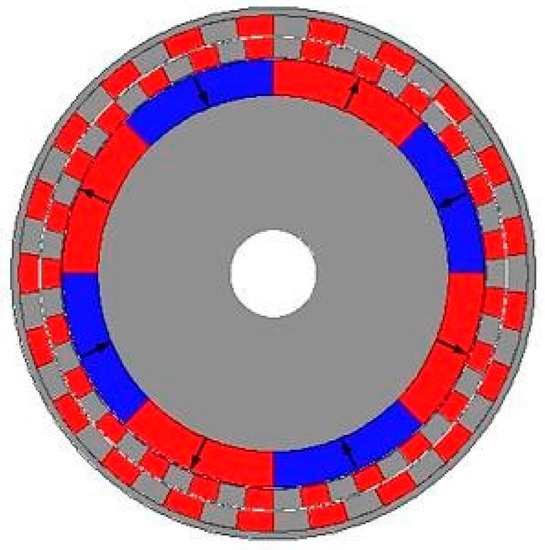 Limited by the frictional loss and low efficiency, conventional mechanical gears have gradually been substituted by emerging magnetic gears (MGs) in the last decade [1,2]. Compared with conventional mechanical gears, the merits of MGs also include overload protection, less maintenance requirements, noise reduction, contactless operation, and less usage of lubrication [1]. On account of the improved performance of MGs in high torque density, high efficiency, and improved reliability, it has a board range of applications. In recent years, MGs have been widely used in the field of aerospace, marine-propulsion, and renewable energy [3]. Inspired by MGs, many permanent magnet (PM) machines integrated with MGs have been proposed and proven to produce a higher torque density than the conventional PM machines [4,5,6]. However, MGs still have not completely substituted mechanical gears in industrial markets because of the increased usage of PMs, which have limited supplies and suffer from unpredictable price fluctuations. For the sake of reducing the employment of PMs and still keep the torque-density of MGs at a high level, different structures of MGs and various arrangements of PMs have been investigated to maximize the torque-density of MGs [7,8,9]. Hereto, the surface-mounted arrangement of PM arrays in MGs is widely considered the foundation of all the concentric circular-structure MGs. Particularly, a configuration of triple-layer PM-excited MGs has gained plentiful graces from researchers for its great progress in torque density increment [8]. Although the advanced arrangements of PM in previous studies contribute tremendously to the existing knowledge of MGs, there is room for further improvement in the PM arrangements in gears [8]. The motivation of this paper is to fill in this gap to further increase the torque per unit PM volume of MGs.