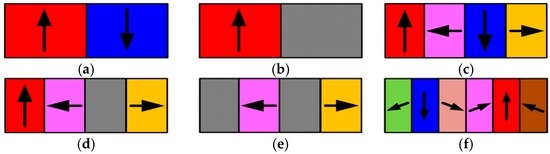 PM arrays: (a) Surface-mounted PM array; (b) Consequent-pole PM array; (c) Halbach PM array I; (d) Consequent-pole Halbach PM array; (e) Inset PM array; (f) Halbach PM array II.