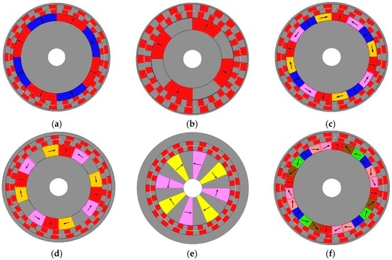 Magnetic gears (MGs): (a) Surface-mounted PM array; (b) Consequent-pole PM array; (c) Halbach PM array I; (d) Consequent-pole Halbach PM array I; (e) Spoke-type PM array; (f) Halbach PM array II.