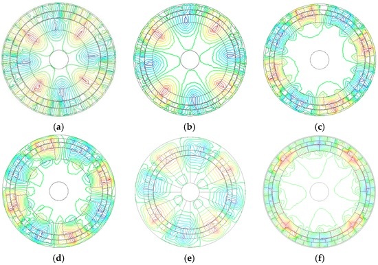 In order to improve the torque per unit PM volume of MGs, six PM arrays are used in the inner rotor as shown in Figure 2. The magnetization direction of each PM segment is labeled by the direction of arrows. The magnetization directions of PMs in the outer rotor and modulating piece in this study are all pointing outward in the radial directions. Figure 2a shows the surface mounted PM array. Figure 2b shows the consequent-pole PM array. Figure 2c shows the simplified Halbach PM array. Figure 2d shows the consequent-pole Halbach PM array. Figure 2e shows the spoke-type PM array. Figure 2f shows the improved Halbach PM array. Although only the rearrange of the inner rotor PM array is considered in this paper, the design method extended to the outer rotor PM and modulation rings are similar. Corresponding full maps of the novel arrays in a complete MG are shown in Figure 3, and the flux line distribution is given in Figure 4.
