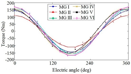 For each Tabu algorithm iteration, the objective function is to maximize the output torque by the computation using the FEM. Then, based on the optimal solution obtained, the optimized solution of each MG topology is also acquired. When the PM volume is set as 40% of the volume of the entire materials, the final results of the maximum torque of each MGs and corresponding parameters are listed in Table 2. The static curves of the torque of each MGs are shown in Figure 5.