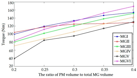 Considering that the PM usage in MGs may change according to practical requirements, the MGs with the ratio of the PM volume to total MG volume ranging from 0.2 to 0.4 are optimized in this paper. The maximal torque variations of each MG with a different PM ratio are shown in Figure 6.