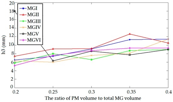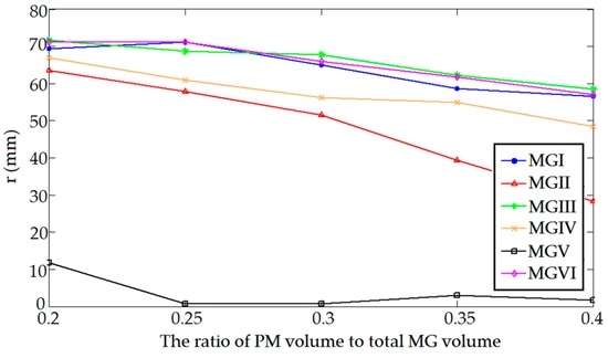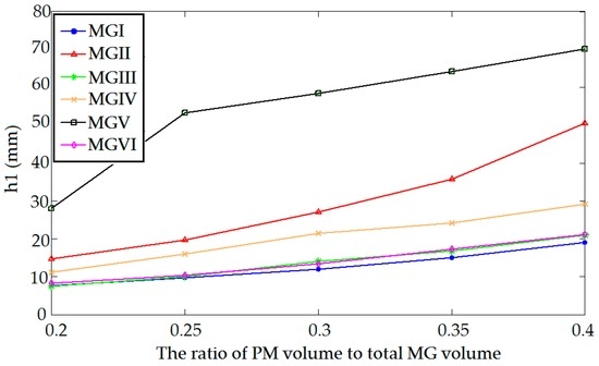 The parameter changes of each MG including r, h1, h2, and h3 are also shown in Figure 7, Figure 8, Figure 9 and Figure 10, respectively. From these results, one can see that, with the same PM usage, the MGs with different PM arrays have various torque performance. When PM usage is the lowest, namely 0.2, MG II produces the highest maximal torque among these MGs. However, when the ratio increases to 0.4, MG II produces the lowest maximal torque density among these six structures. Overall, it is shown that the torque of MG I and MG II have a tendency towards saturation as the PM material usage increases in MG. It is also shown that, with the increasing usage of PM material, there is a rapid increase in the maximal torques of MG V and MG IV, but for MG II the torque increases relatively slowly due to the flux saturation caused by its PM structure and MG volume limitation. The Halbach PM array-based MG presents a higher torque density, especially in cases where the proportion of the PM volume is larger than 0.35.
