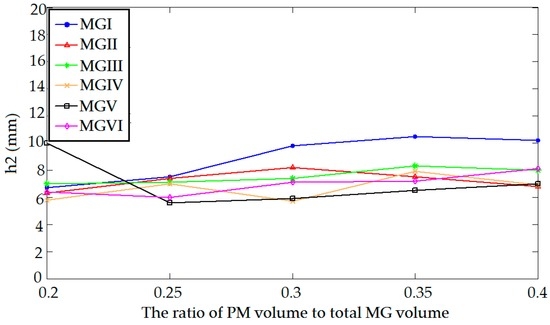 The optimized height of the stationary modulation poles (h2) versus the different PM usages of the MGs.