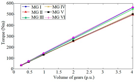 The size of the MGs may change according to practical requirements. Optimized PM arrays with one specific size may not produce the largest torque when the size of the gear changes. To solve this problem, another numerical experiment is done to measure the maximal torques with the changed volume of the MGs. The simulation is done with a PM-volume-to-total-gear-volume ratio of 0.35. The length of the gear is fixed, and the area of the gear is scaled twofold and fourfold, and is shrunk to half and fourth of its original size. As shown in Figure 11, the results indicate that, for each gear, the torque increases with the MG volume at a fixed proportion of growth. Consequently, when the size of the gear is scaled up and out, but its topology stays unchanged, its torque increases and reduces. They have a linear relationship.