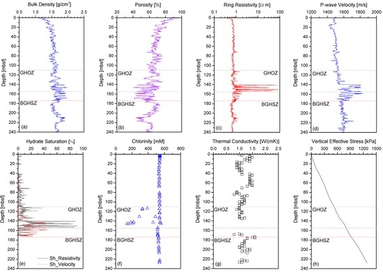 Logging-while-drilling (LWD) and core test results at Site UBGH2-6: (a) bulk density; (b) porosity; (c) chlorinity; (d) thermal conductivity; (e) ring resistivity; (f) P-wave velocity; (g) hydrate saturation; and (h) vertical effective stress. Thermal conductivity and chlorinity results were obtained from core tests. The base of gas hydrate stability zone (BGHSZ) at this site was estimated to occur at 174 mbsf (as denoted with a red dotted line), and the gas hydrate occurrence zone (GHOZ) was found to be from 110 mbsf to 155 mbsf (as denoted with a gray dashed line). All the data was gathered from Lee et al. [18] and Ryu et al. [3,4].