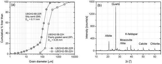 The physical and index properties of sediments, such as porosity, grain size distribution, mean grain size, grain shapes, and mineralogy, are known to play a role in determining the morphology, extent, and growth characteristics of natural gas hydrates [20]. Thus, these properties are baseline parameters for estimating the geomechanical, transport, and thermal properties of hydrate-free, hydrate-containing, and post-dissociation sediments [21]. Furthermore, they can provide valuable information for predicting hydrate occurrence in sediments. In this section, we present the physical and index properties of sediment sample 6B-22R, including grain size distribution, fines content, mean grain size, scanning electron microscope (SEM) images of grain shapes, and mineralogy obtained through X-ray diffraction (XRD) analysis.