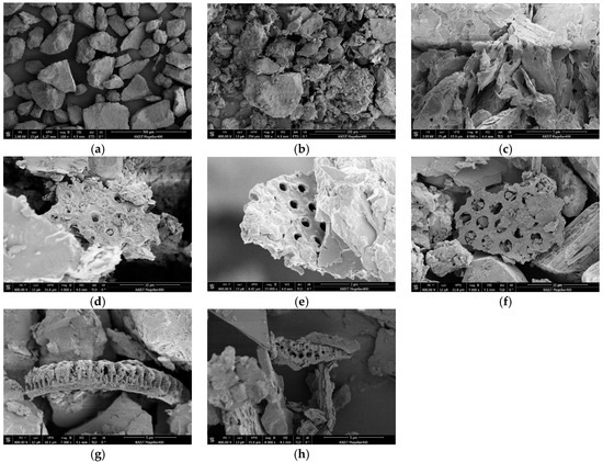 The particle shape and surface texture of sample 6B-22R were investigated using SEM images (Figure 5). The dominant grains are sand particles with high angularity (Figure 5a), corroborating the particle size distribution and XRD results. Sand particles are covered by platy fine minerals (i.e., clay and silt), which are ~1–5 μm in size (Figure 5b,c). A number of the fine minerals were found to have sub-microscale pores on their surface (Figure 5d–h). Such porous minerals, with nano- to micro-pores, possibly represent fragments of diatomaceous silicate minerals, so thought because microfossils of siliceous planktonic algae (or diatoms) typically show porous silica skeletons [23]. Although the presence of diatoms is predominantly limited to the clay and silt particles, the sample should exhibit a relatively high specific surface area compared with other sandy sediments with similar fines fractions. This is due to the internal pores on diatoms. Thus, such internal pores may play an important role in determining the physical properties of natural sediments, leading to a high natural water content and high plasticity [6,7,22,24].