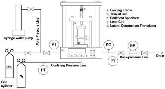 Similarly, SM samples from Eastern Nakai Trough showed a porosity of 39.1%–54.1% under confined conditions; in particular, the porosity of the majority of the remolded samples was higher than that of the original samples from the pressure cores [25]. The initial packing conditions of our SM core samples are comparable to previous studies; hence, the obtained strength results are presumed to be valid and are readily expandable. At least, they may serve as a lower bound as a result of the high initial packing porosities. After assembling the triaxial cell, the targeted confining stress (σc) was achieved by injecting nitrogen gas (Figure 6). Then, the specimen was fully saturated with water as follows: Carbon dioxide was injected into and circulated through the specimen at a low pressure (~0.2 MPa) in order to remove air; a vacuum of −80 kPa was then applied to remove the carbon dioxide from the specimen. After repeating this process three times, de-aired water was introduced at the bottom using a syringe pump (500HP, Teledyne ISCO, Lincoln, NE, USA). While maintaining the confining pressure greater than the pore pressure, a back pressure (or pore pressure) of ~0.33–1.13 MPa was applied to achieve 100% water saturation. While maintaining this back pressure, the water injection rate was monitored, and the specimen was seated for more than 6 h until there was no inflow into the specimen. In all tests, B-values of >0.9 were achieved. Thereafter, the confining stress (σc) was adjusted to achieve the targeted effective confining stress; herein, five isotropic effective confining stresses (σ′c) of 0.32, 0.63, 1.47, 2.58 and 5.25 MPa were applied to the fully water-saturated specimens prior to shearing, i.e., at the consolidation stage. Note that these specimens were prepared from the same sand. This stress range was chosen to cover the in situ vertical effective stress of the sand layer from which the sediment core was retrieved, i.e., ~0.75 MPa (Figure 2h and Table 1). This stress value (~0.75 MPa) was estimated from the logging results of bulk density and porosity (Figure 2a,b). The initial conditions of effective confining stress and pore pressure for all of the tested specimens are summarized in Table 3. In this study, we were not able to measure the changes in void ratio during the consolidation stage owing to the difficulty in the saturation processes in that back pressure was applied. Instead, the initial packing void ratio prior to consolidation was used to estimate the volume change behaviors during shearing. If the change in void ratio during the consolidation stages was measured, it would have rendered a more precise measurement of volumetric strain. Nevertheless, the tendency of the measured volume change behavior remains valid owing to the low fraction of clay (~1.3%) in the tested sample.