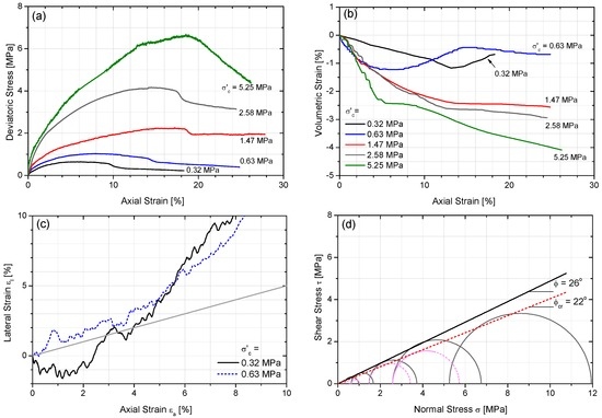Once each water-saturated specimen was prepared under a given isotropic effective confining stress condition, the specimen was subjected to shear under a drained condition. Shear stress started to increase as additional vertical stress (deviatoric stress, σd) was applied at a constant axial strain rate. For the five tested specimens, the rate of axial strain (or shearing rate) was kept constant at 0.1% per min (0.076 mm/min; ASTM D7181-11) [26]. The shearing continued to an axial strain (εa) of 25%, with the exception of the case under the lowest confining stress. Changes in specimen volume were logged using the syringe pump that maintained the back pressure. For the two cases with effective confining stresses of 0.32 MPa and 0.63 MPa, the lateral deformation of each specimen, or the change in the central diameter of the specimen during shear, was measured using a local displacement transducer (LDT) mounted at the middle height of the specimen [27,28]. This lateral deformation measurement allowed for the estimation of the Poisson’s ratio of the sample.