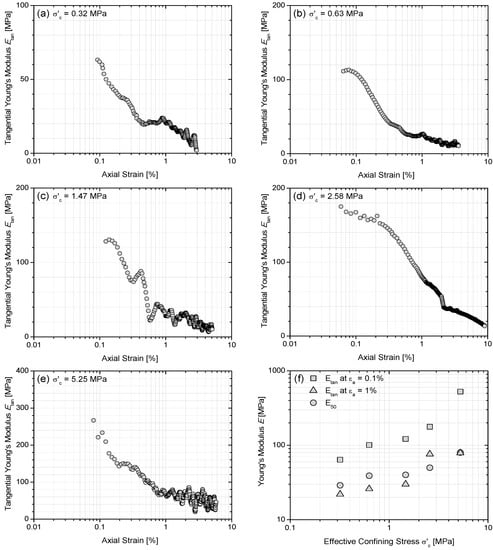 Variation of tangential Young’s moduli as a function of axial strain at different effective confining stresses (σ′c): (a) 0.32 MPa; (b) 0.63 MPa; (c) 1.47 MPa; (d) 2.57 MPa; (e) 5.25 MPa; and (f) variation of Young’s moduli as a function of effective confining stresses.