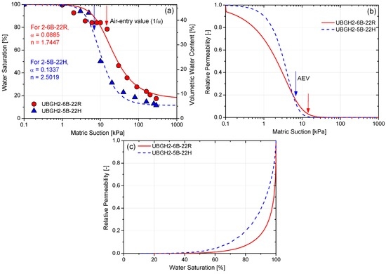 Figure 10a presents the changes in the volumetric water contents experimentally gathered with increasing matric suction for samples 6B-22R and 5B-22H. These experiment results were fitted using Equation (1), resulting in the water retention curves for the tested sediment samples. The air entry value (AEV) of 1/α was determined as 11.3 kPa and 7.5 kPa for 6B-22R and 5B-22H, respectively. As sample 6B-22R has lower particle sizes and a higher fraction of fines (Figure 4a), it exhibited a higher AEV and a lower slope. However, the values of residual water saturation for both samples are similar (~10%–20%).