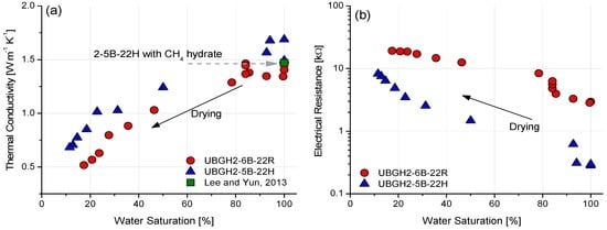 A change in water permeability with decreasing water saturation was observed in samples UBGH2-6B-22R and UBGH2-5B-22H. The thermal conductivity and electrical resistance were measured using a thermal water retention testing device. The water retention curve was fitted to the Maulem-van Genuchen equation, and the fitting parameters were extracted. For both sediments, water permeability was observed to decrease sharply as water saturation decreased. The 6B-22R sediments showed a higher AEV and a lower slope than those of 5B-22H due to the small particle size and high fraction of fines. However, residual water saturation was ~10%–20% in both sediment samples. As the gas phase fraction increased to ~80%–90%, the thermal conductivities of both samples decreased by ~60% (from ~1.4–1.6 W·m−1·K−1 to ~0.5–0.7 W·m−1·K−1). The opposite trend of increasing electrical resistance with increasing gas fraction was observed for electrical resistance with a quasi-linear tendency. Such a reduction in water saturation will likely occur when the dissociation of gas hydrate inevitably produces free gas in sediments.