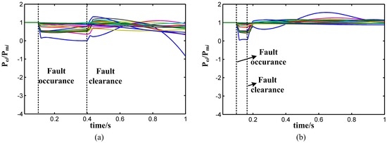 The variation of Pei/Pmi of 16-machine 68-bus system: (a) unstable case; and (b) stable case.
