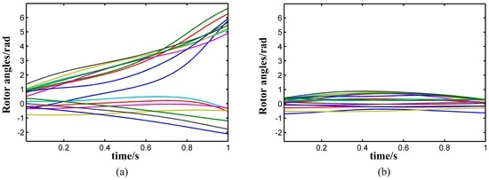 Generator rotor angles of 16-machine 68-bus system: (a) unstable case; and (b) stable case.