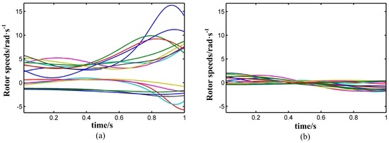 Generator rotor speeds of 16-machine 68-bus system: (a) unstable case; and (b) stable case.