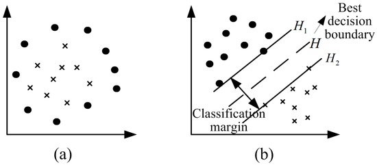 Figure 7 shows the basic principle of SVM. The actual dataset is usually linearly inseparable (Figure 7a), then this dataset is transformed into a new space using a nonlinear mapping, also called as the kernel function K(xi,xj). The transformed data may become linearly separable that much easier to find the best decision boundary with the maximum classification margin, also the minimum classification risk (Figure 7b).