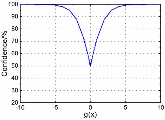 Figure 8 shows the value of CI versus g(x). For the binary classification problem of transient stability prediction, the CI of SVM output is between 50% and 100%. If g(x) = 0, then P(C+1|x) = P(C−1|x) = 50%, thus CI = 50%. If g(x) = +∞, then P(C+1|x) = 100% and P(C−1|x) = 0%, the unknown instance will be identified as absolutely stable. The distance between the unknown instance and the decision boundary is infinitely great, thus CI = 100%. If g(x) = −∞, then P(C+1|x) = 0% and P(C−1|x) = 100%, the unknown instance will be identified as absolutely unstable, and CI = 100%. Therefore, when given an unknown instance, we can obtain not only the prediction result, but also its confidence index.