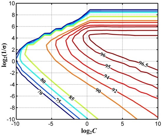 The performance of a SVM classifier is greatly influenced by the parameter selection. Generally, a grid-search process, which is time-consuming, should be used to find the optimal parameters to build a reliable SVM classifier. Figure 9 shows the selection results of SVM parameters using the dataset in Section 5.1. The horizontal and vertical coordinates are the log base 2 of parameters C and 1/σ. The contour lines with different colors represent the accuracies using different parameters. During the grid-search process, many classifiers are generated to find the optimal parameters. It can be seen that multiple classifiers using different groups of parameters has high accuracies. When selecting a classifier using one group of parameters, the other obtained useful classifiers are abandoned. Actually, there are rules in the selection of SVM parameters: when the value of C is larger whereas 1/σ is smaller, the performance of SVM classifier is better. Therefore, the SVM-based ensemble classifier is proposed using different groups of SVM parameters within an experience range.