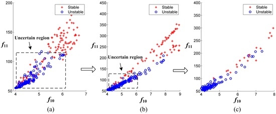 Considering the selection of response time and the balance between accuracy and speed of transient stability prediction, the separability of the instances with different response time is studied first. Figure 10 shows the feature space of f10 versus f11 using some instances in Section 5.1 at different response times after the fault clearance. Figure 10a shows the feature space at t = 0.0167 s (one sampling period for 60 Hz system) after the fault clearance. There are many overlaps among the stable and unstable instances that are difficult to separate. The overlapping region can be called the uncertain region and the instances in uncertain region are uncertain instances. Figure 10b shows that there are fewer uncertain instances at t = 0.5 s, and when t = 1 s, the uncertain instances are rare (shown in Figure 10c).