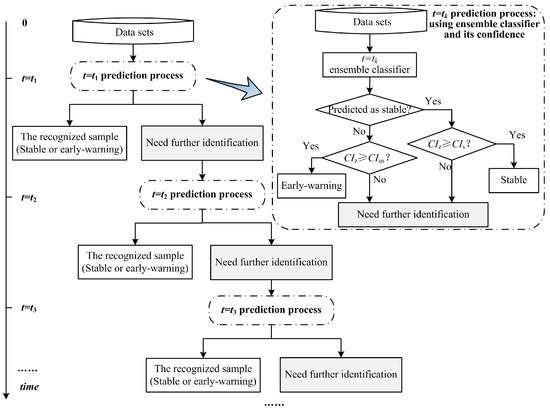 Based on the above analysis, a hierarchical scheme is proposed for transient stability prediction, shown in Figure 11. In this hierarchical scheme, multiple classifiers with different response times constitute the different layers, or levels for transient stability prediction. For an ensemble classifier at t = t1, if an instance is predicted as stable, only when CIZ ≥ CIs will this instance be determined as stable. If an instance is predicted as unstable, only when CIZ ≥ CIus will the early-warning be carried out. The values of CIs and CIus are manually set. Those instances with lower confidence of prediction results will be identified as uncertain and need further identification. The instances far away from the boundary will be identified at the first layer with short response time, which ensures the rapidity. For those uncertain instances, more credible prediction results will be provided with longer response time, which ensures the accuracy. Therefore this hierarchical prediction scheme is a good solution to balance the rapidity and accuracy.