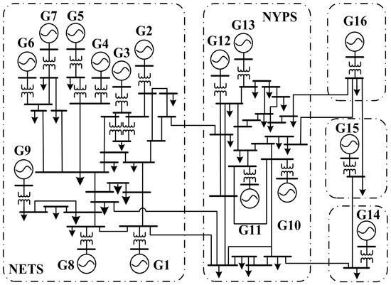The test system chosen in this research is the 16-machine 68-bus reduced order equivalent model of the New England Test System and the New York Power System (NETS and NYPS), shown in Figure 12. Detailed parameters of this system can be found in [25]. The system frequencies are 60 Hz.