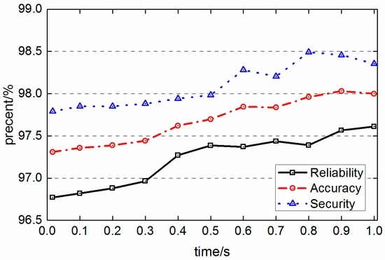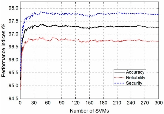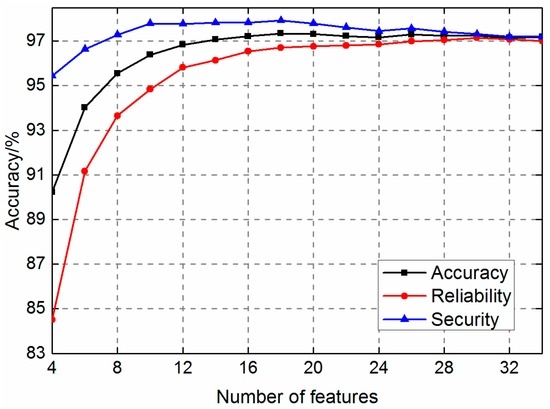 To build the SVM-based ensemble classifier, the number of selected features and SVMs, s and k, should be determined. Firstly, set the number of selected features s = 20 (nearly 60% features are selected), then the reliability, accuracy and security of the ensemble classifier using different numbers of SVMs are shown in Figure 13 (the response time tk = 0.0167 s).