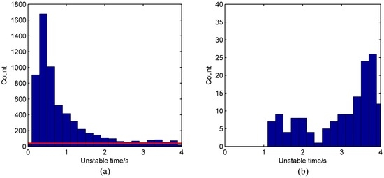 Histogram of unstable time: (a) Total testing unstable instances; and (b) Uncertain unstable instances after tk = 0.6 s.