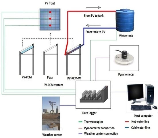 A represent the heat loss and cross-section area of the PV panel, respectively. Applying Equations (3)–(5), on the measured data, it is found that the front surface of the reference PV discarded 380 Wh/day to ambient, which was reduced to 242 Wh/day (for PV-PCM) and 232 Wh/day for PV-PCM with water flow.