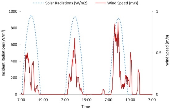 Vw) remained very low with a peak and average values of 0.9 m/s and 0.2 m/s. The airflow around the PV surface caused by windy conditions induces natural convection heat losses empirically predicted by Tiwari [