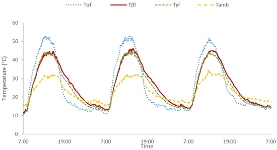 Tγf, respectively, rendering an average temperature drop of 5 °C compared to the PV without PCM. The water circulation at 13:00 induced a slight additional temperature drop observed in