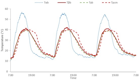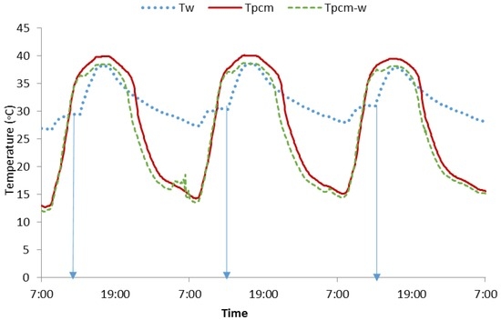 Tγf with a time lag caused by a higher thermal inertia achieved by the inclusion of the PCM (in PV-PCM and PV-PCM-W) compared to the PV alone. The