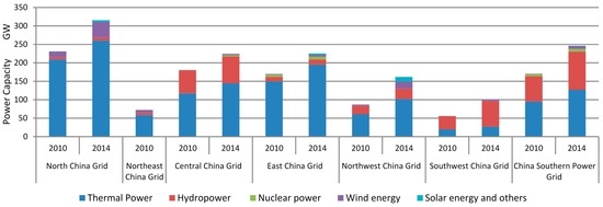 Power capacity in the regional grids in China in 2010 and 2014; unit: GW. Source: Reproduced with permission from [6,11].