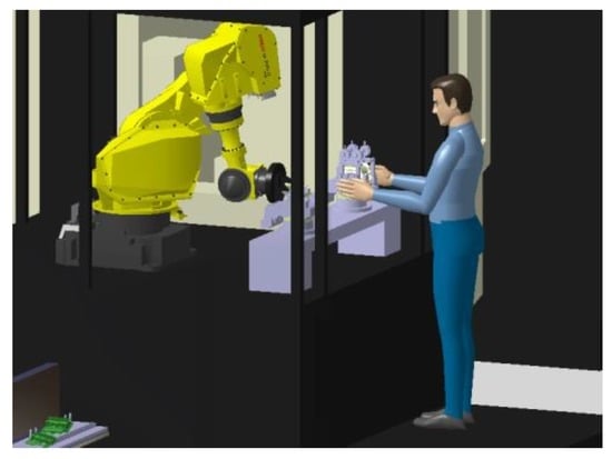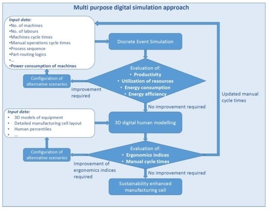 32]. Moreover, specific aspects relevant for the sustainability of the manufacturing cell, such as power load, energy efficiency, safety of working environment, and ergonomics, are assessed in this paper through the multi-purpose digital simulation approach based on DES and 3D simulation.