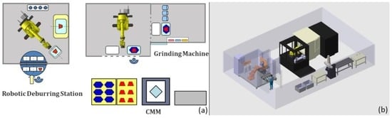 Figure 2a, the reconfigured manufacturing cell consists of the following components: a grinding machine tool with a loading/unloading robot; a CMM; a robotic deburring station including a robot, a deburring tools post, a rotary table for part input/output, and a touch-probe inspection device to check the part before deburring.