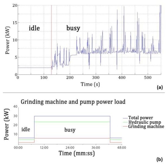 Figure 3b, showing a time window of 48 min) and provided the evaluation of energy consumption for the main manufacturing cell components. The energy consumption of the manufacturing cell components during the fabrication of one batch of 34 parts was equal to 1562 kWh for the grinding machine; 37 kWh for the CMM; and 93 kWh for the deburring station (