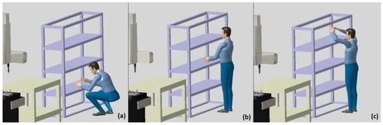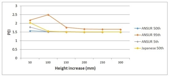 Table 2 shows the improvement of the PEI values across all percentiles obtained by optimizing the fixtures’ shelf height. The most significant enhancement was achieved for the ANSUR 50th percentile, where the PEI values dropped to 42% of the starting configuration.