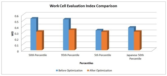 The main objective in terms of ergonomic improvement was to obtain a lower WEI value for the manufacturing cell. Based on the PEI values of each operation and the corresponding estimated operation time, the WEI values for each percentile were calculated for the manufacturing cell before and after the posture optimization. The values for the different percentiles are shown in