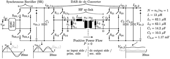 The investigated single-stage (1-S), single-phase ac-dc converter topology shown in Figure 1 consists of a synchronous rectifier (SR) and isolated full-bridge dual active bridge (DAB) dc-dc converter as the core building block, putting a small high-frequency (HF) filter capacitor in between. Also shown in Figure 1 are the principle current and voltage waveforms at the different converter ports. The SR switches at each zero-crossing of the ac line voltage , folding it into a dc voltage that varies according to the absolute value of , i.e., at twice the 50 Hz line frequency (), and that is directly fed to the input of the DAB dc-dc converter: