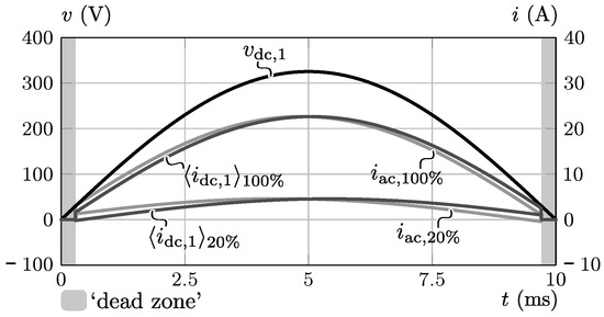 Ideal ac input-side quantities , , and within a 10 ms half period of the grid voltage for (100% power) and (20% power).